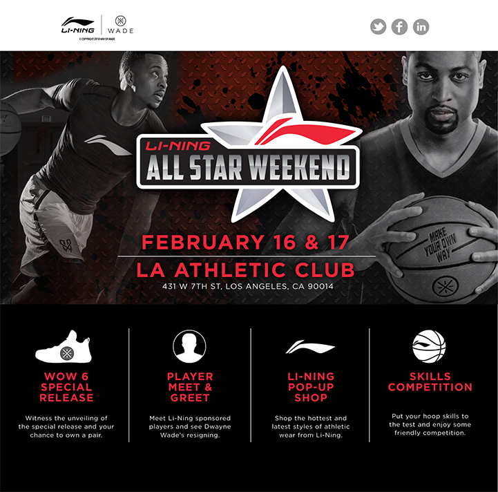 A global sportswear brand rooted in performance andinnovation, Li-Ning set out to make a splash during NBA All-Star Weekend in Los Angeles—featuring their U.S.-based basketball athletes including Dwyane Wade, Jawan Evans, Udonis Haslem and CJ McCollum.