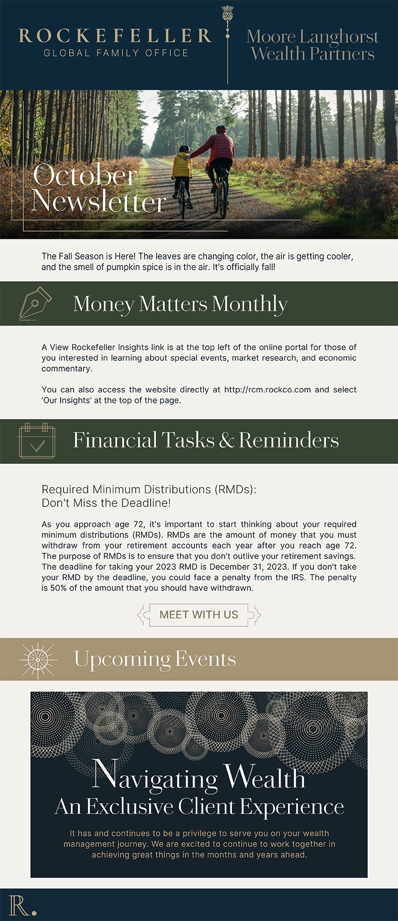 As trusted advisors within the Rockefeller Family Global Office, this Dallas-based team is deeply committed to their client relationships. They wanted a thoughtful, branded way to stay connected—offering monthly updates, timely reminders, and staying visible to those who matter most. They also saw an opportunity to grow awareness more broadly in the Dallas market.